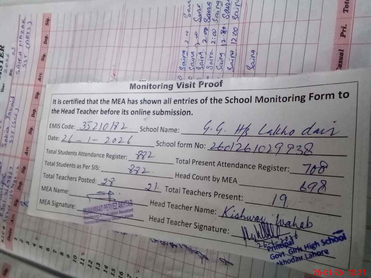 | Attendance Register | Head Teacher | MEA with School | Visit Proof |