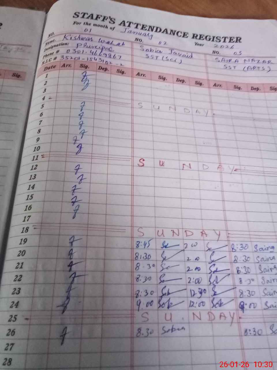 | CNIC | Full Name | Designation | R/C | Absence during last cal. month |