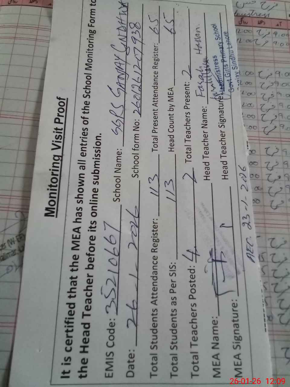| Attendance Register | Head Teacher | MEA with School | Visit Proof |