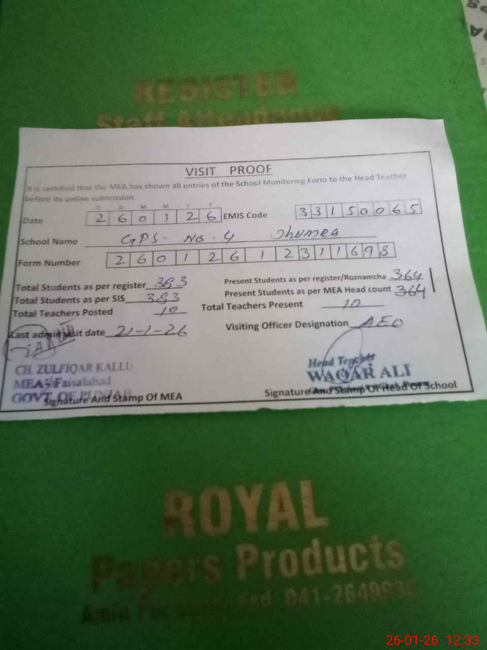 | EMIS Code: 33150065 | Name of School: GPS 4 CHAK JHUMRA CHINIOT ROAD | |||