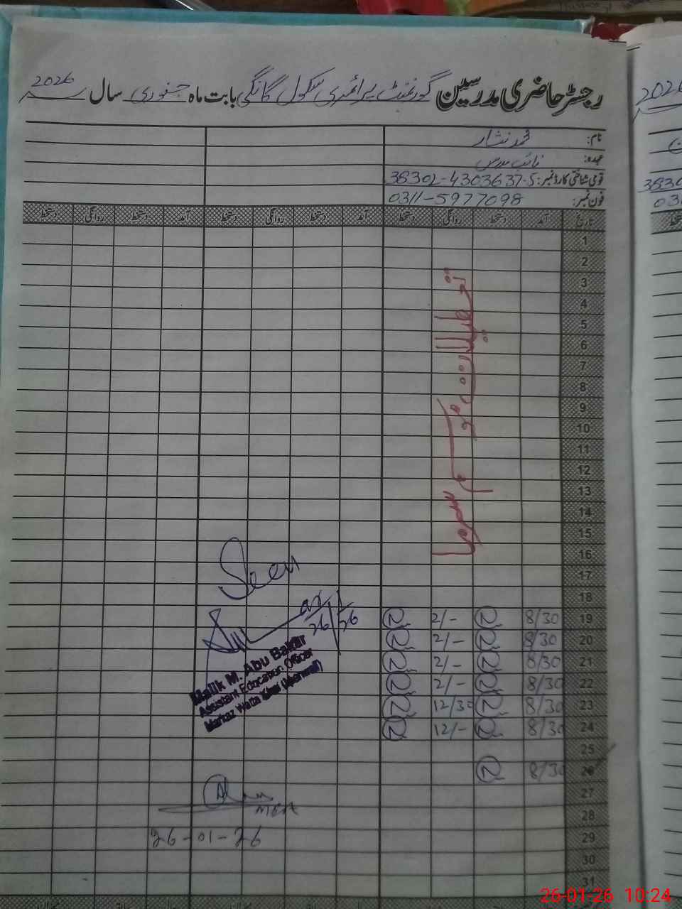 | Name: MU**** SH**** KH**** Designation: (School Headmaster's/Headmistress's) PST Phone/Cell Number: 03**** |