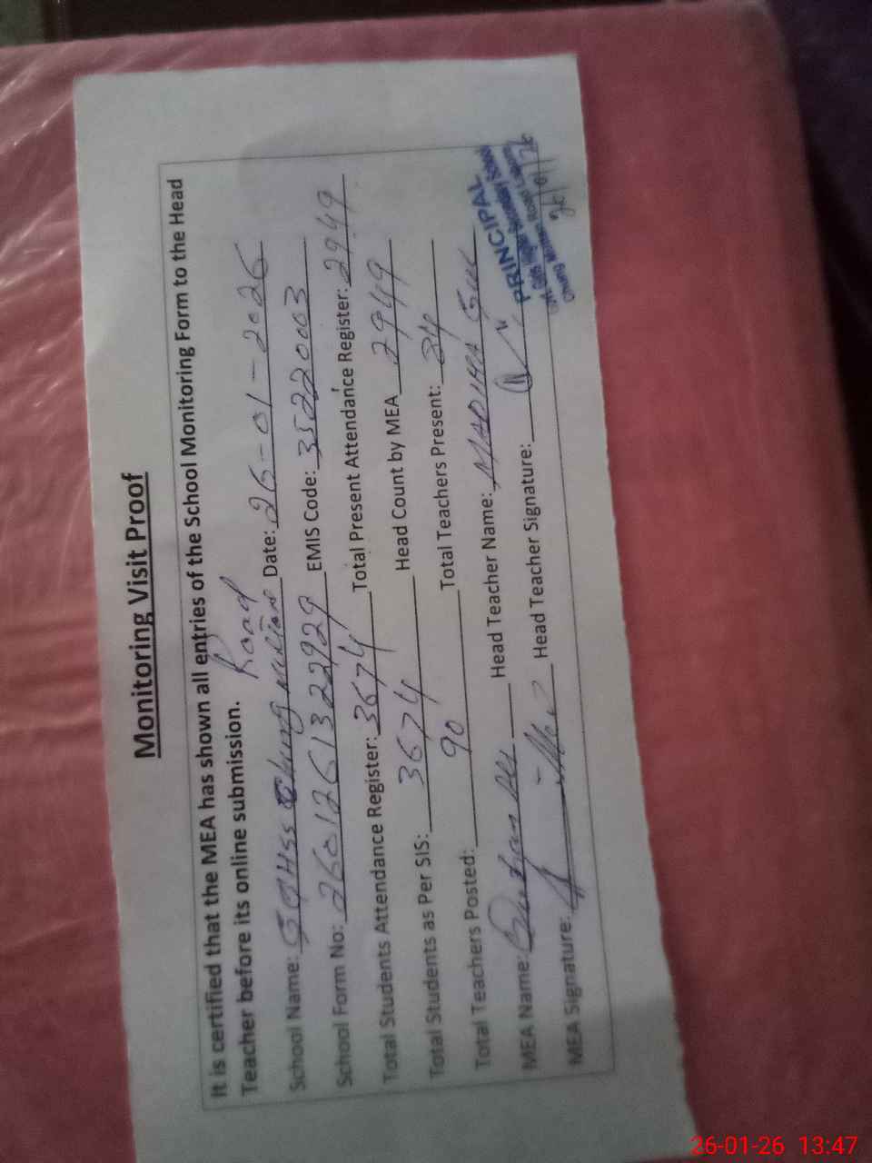 | Remarks (Use Separate Page if Required): Administrator visit of the CEO, DEO, Dy DEO in the school in 2025 not available with signed.on the Register.but during the flood camp visited in the school CM, CEO, DEO this is the latest visits latest Administrator visit of the AEO on 25th November 2025 | |||||