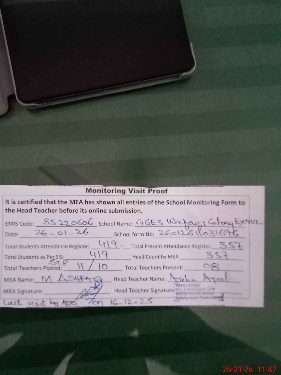 | Attendance Register | Head Teacher | MEA with School | Visit Proof |