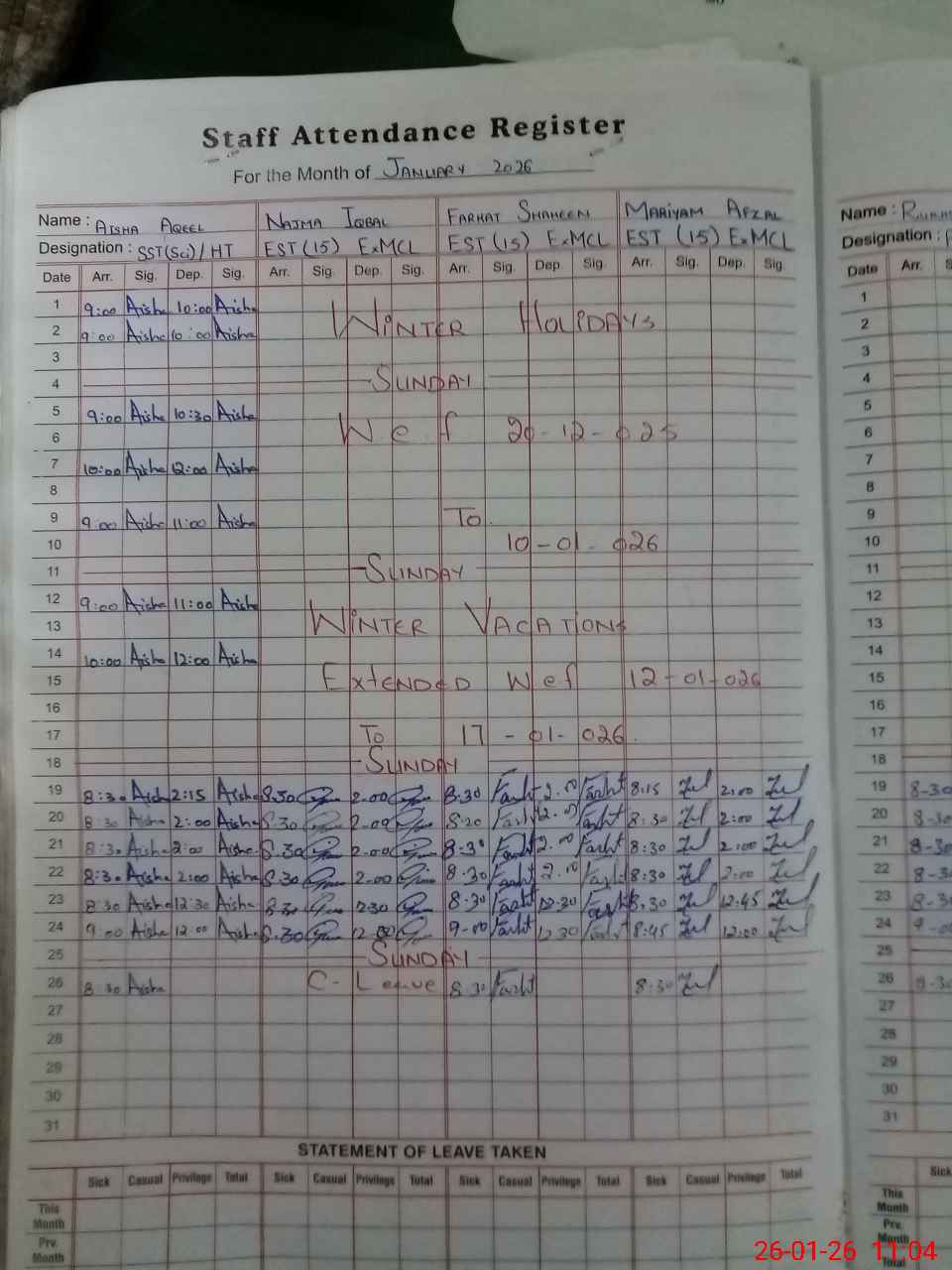 | Leave | Duty | Absent | Maternity | Medical | Ex- Pak |