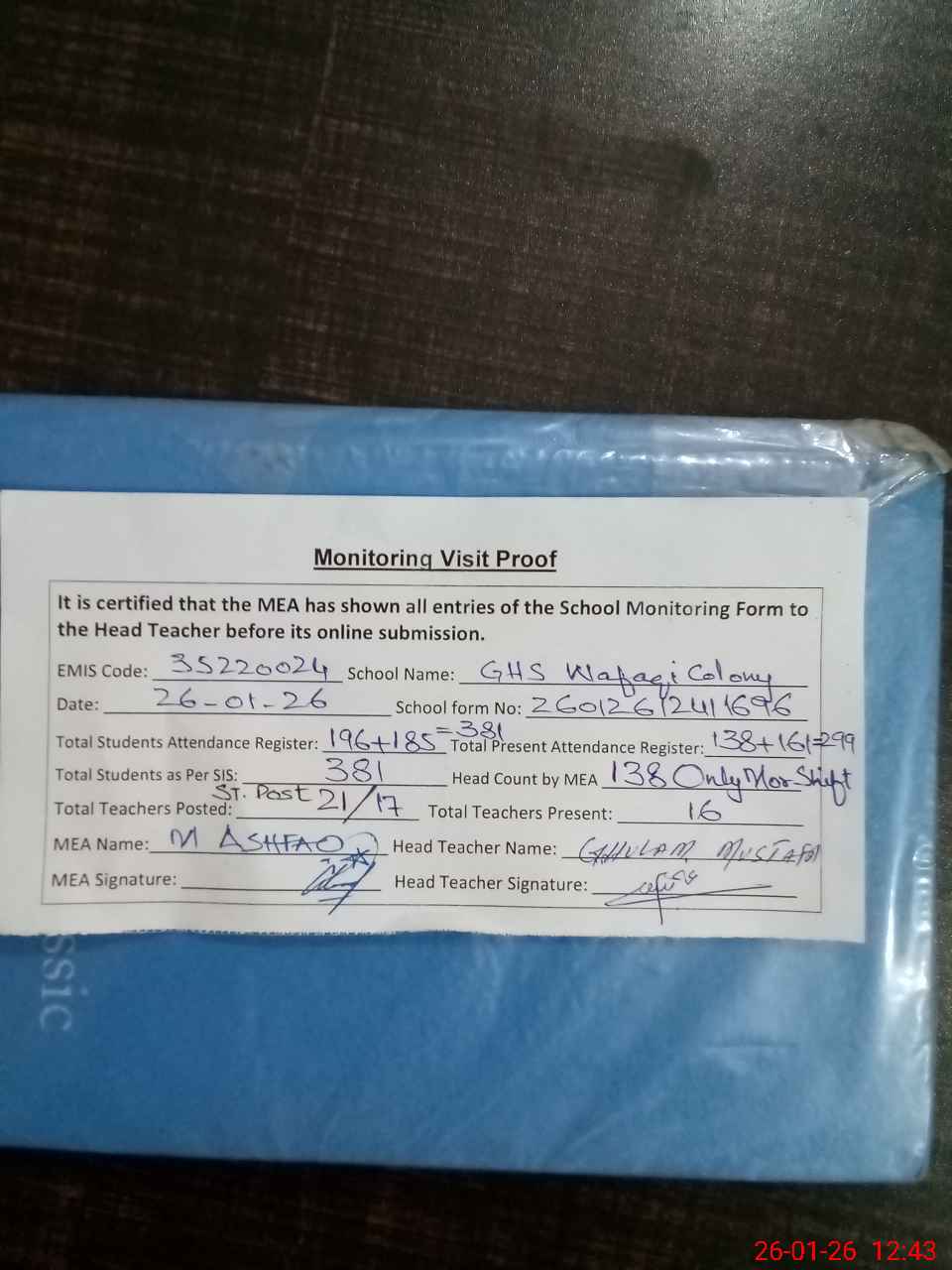 | EMIS Code: 35220024 | Name of School: GHS WAFAQI COLONY LAHORE | |||