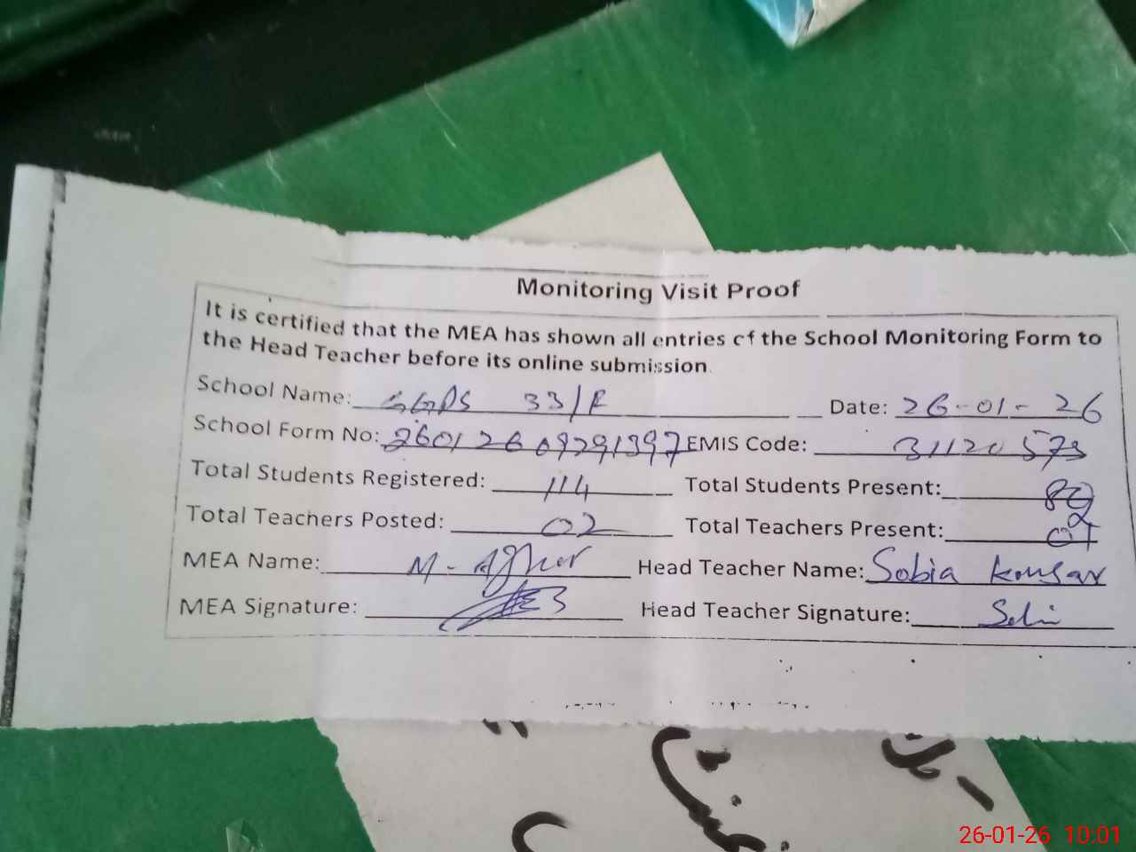 | Attendance Register | Head Teacher | MEA with School | Visit Proof |