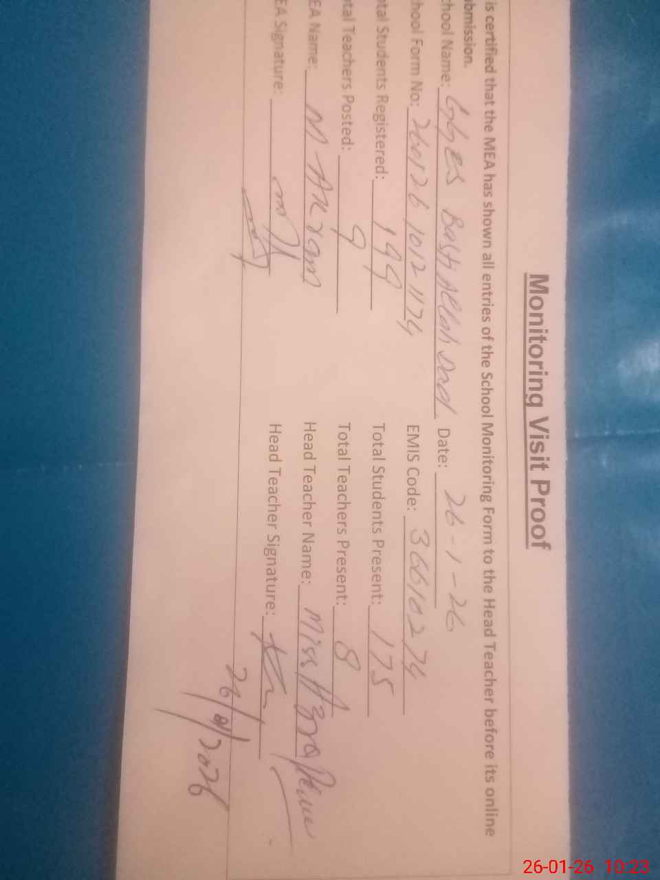 | Attendance Register | Head Teacher | MEA with School | Visit Proof |