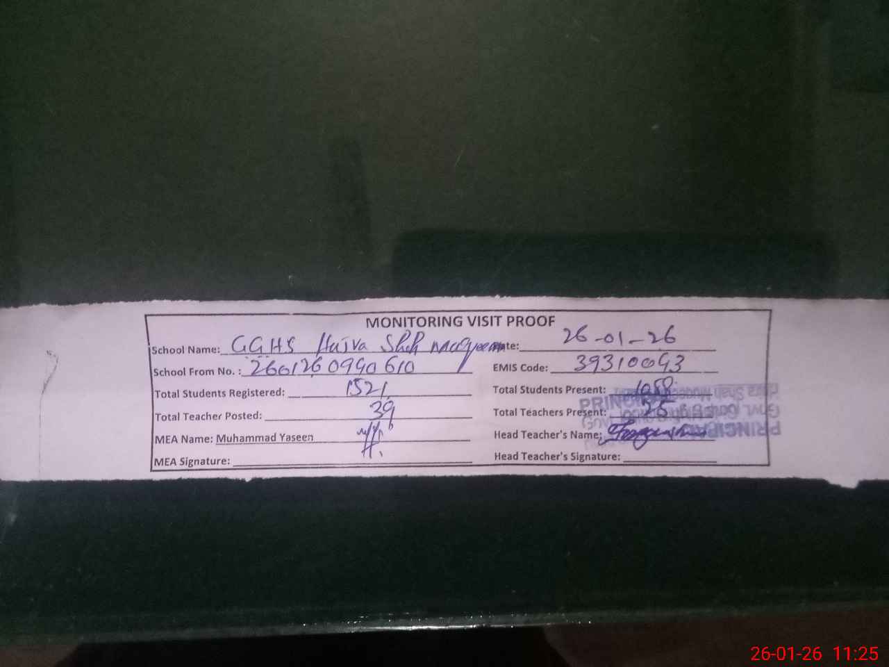 | Attendance Register | Head Teacher | MEA with School | Visit Proof |