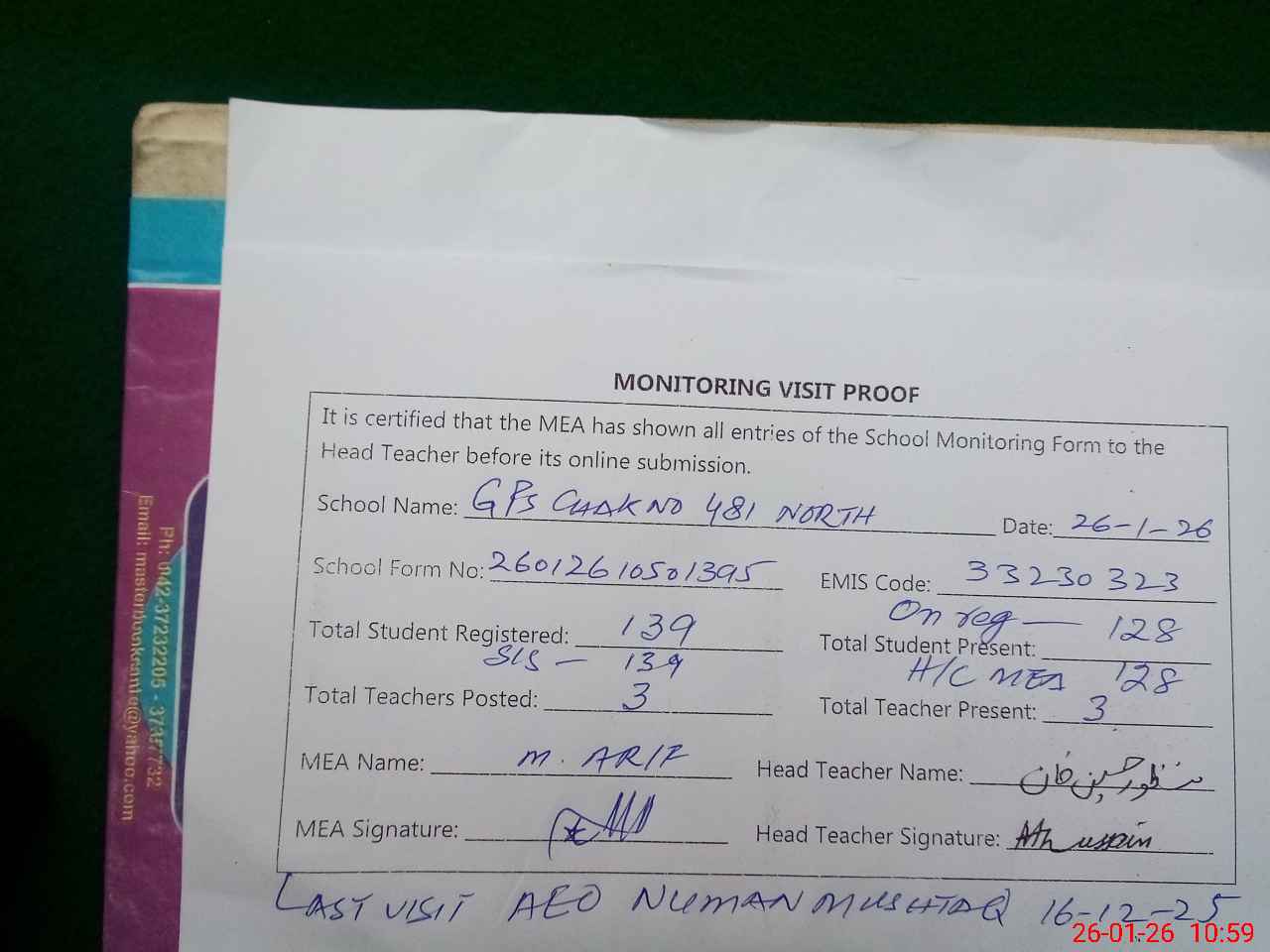 | EMIS Code: 33230323 | Name of School: GPS CHAK NO 481 NORTH | |||