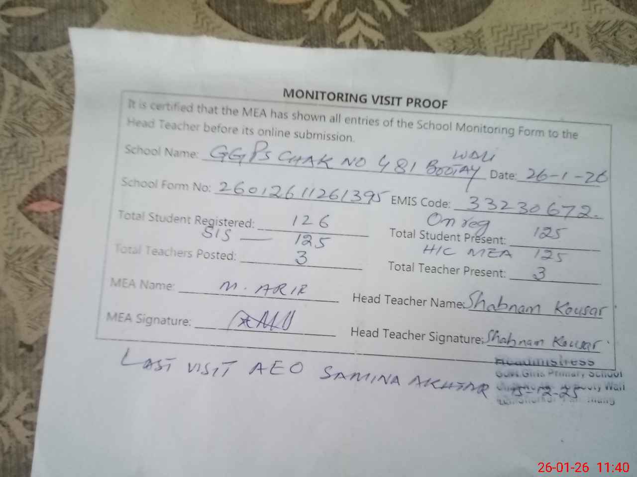 | Certified that this School was Inspected by the Undersigned MEA/DMO Today and the Information Stated Above is as Per Record. | |||||