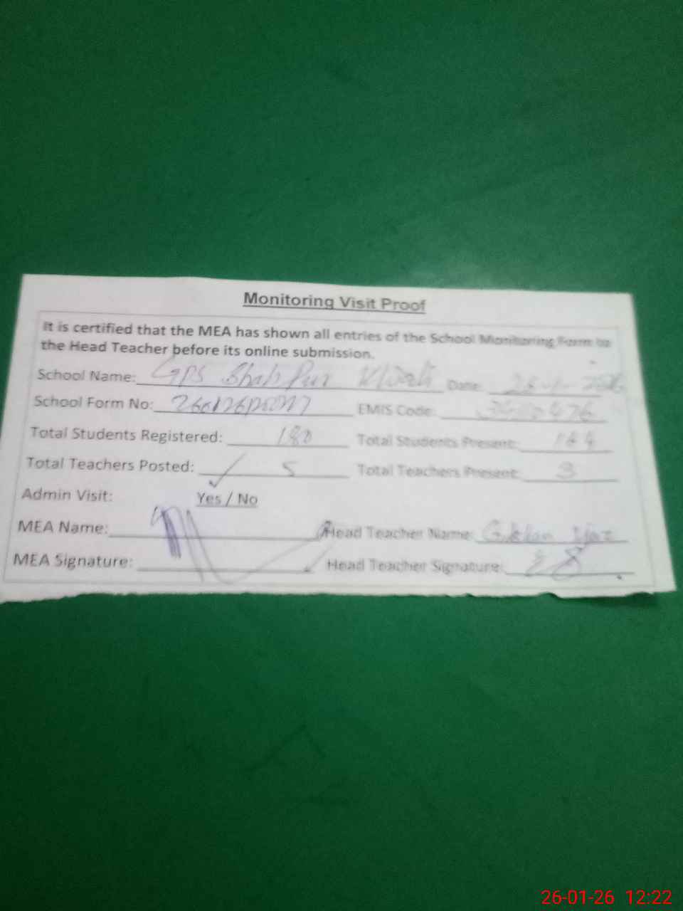 | Attendance Register | Head Teacher | MEA with School | Visit Proof |