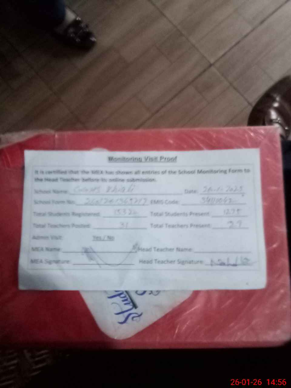 | Attendance Register | Head Teacher | MEA with School | Visit Proof |