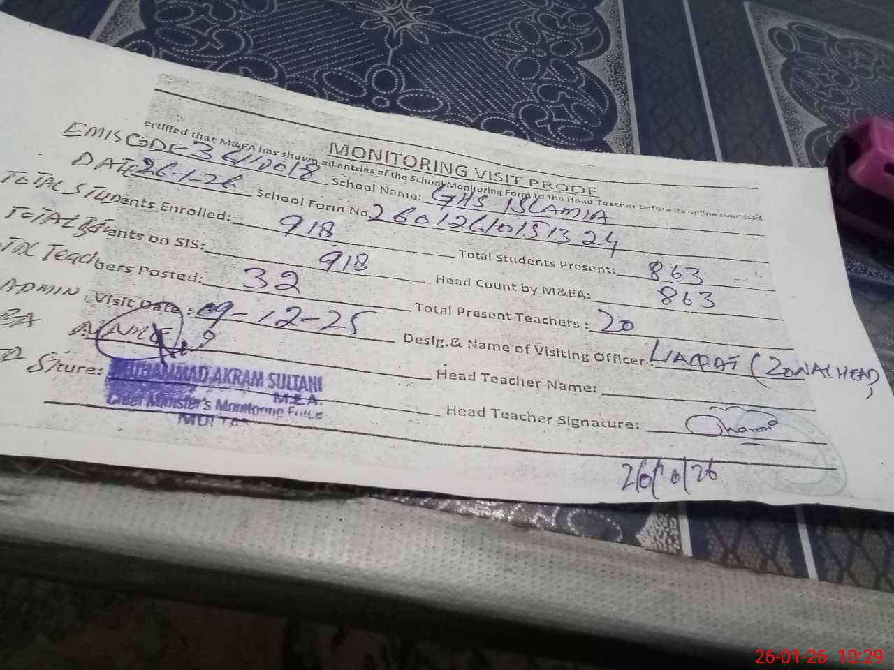 | Attendance Register | Head Teacher | MEA with School | Visit Proof |