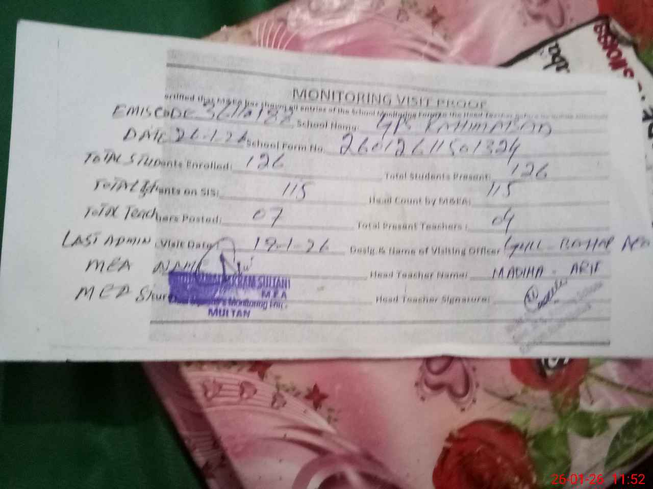 | EMIS Code: 36110188 | Name of School: GPS MC RAHIMABAD MULTAN | |||