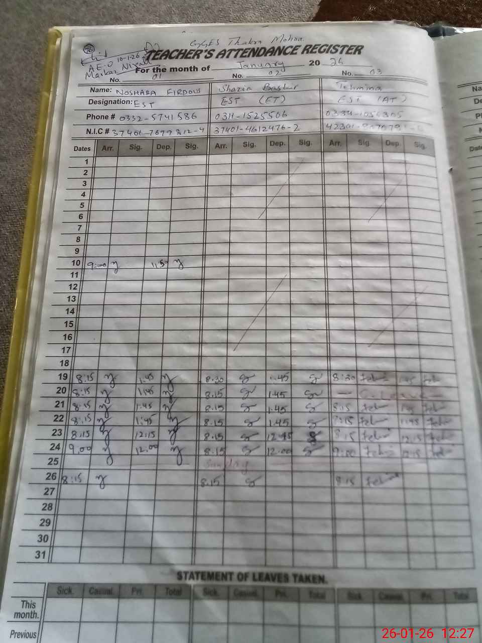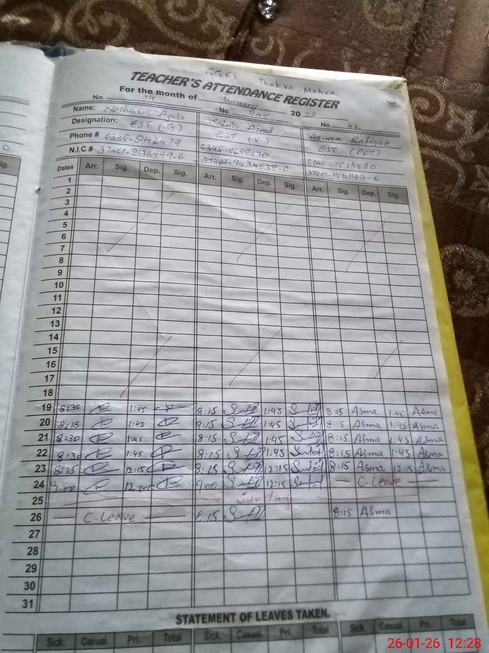 | CNIC | Full Name | Designation | R/C | Absence During Last Calender Month |