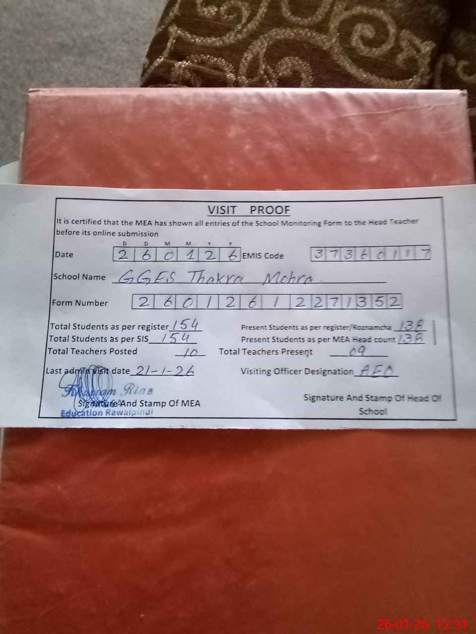 | Attendance Register | Head Teacher | MEA with School | Visit Proof |
