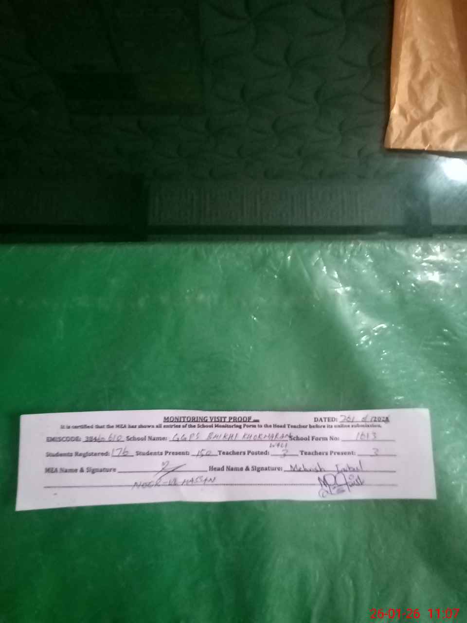 | Attendance Register | Head Teacher | MEA with School | Visit Proof |