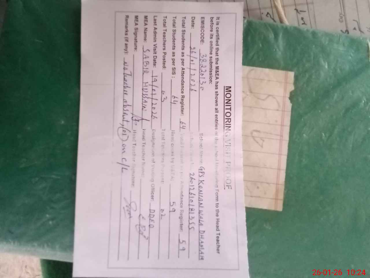 | Remarks (Use Separate Page if Required): no teacher absent total students on register 64 total students on SiS 64 last admin visit by DDEO 19 Jan 2026 | |||||