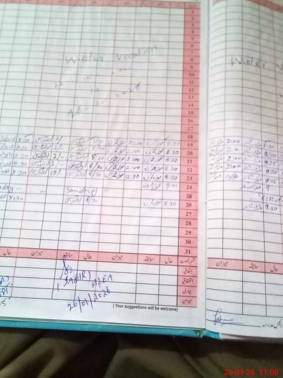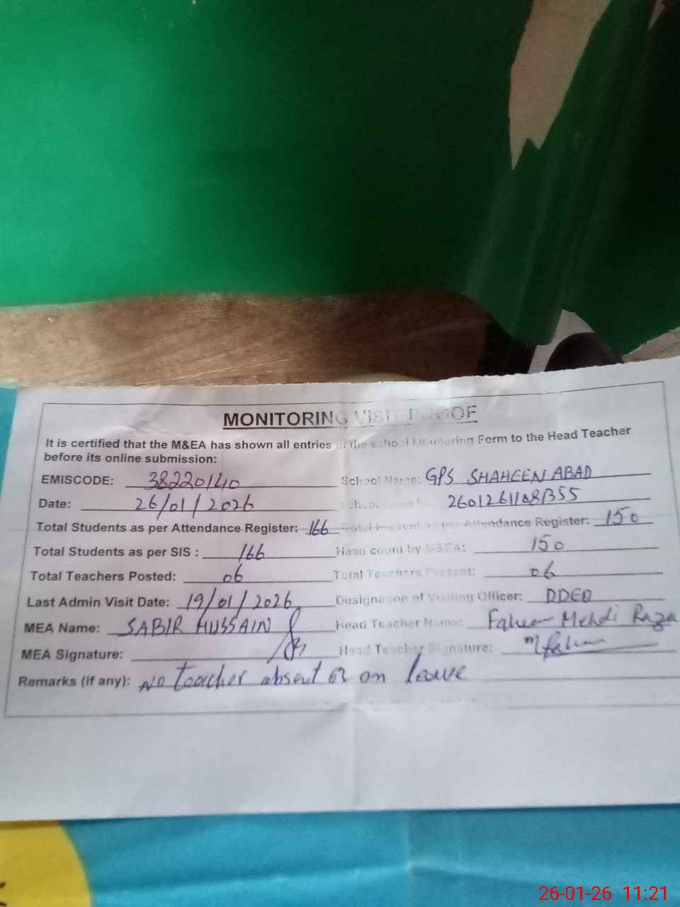 | Remarks (Use Separate Page if Required): no teacher absent total students on register 166 total students on SiS 166 last admin visit by 19 Jan 2025 | |||||