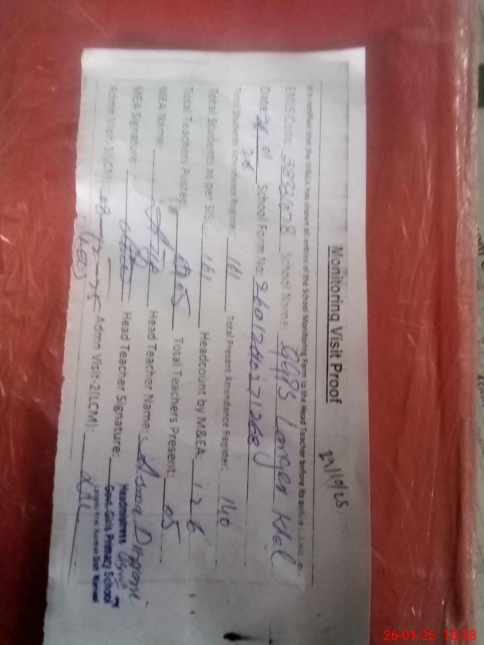 | Attendance Register | Head Teacher | MEA with School | Visit Proof |