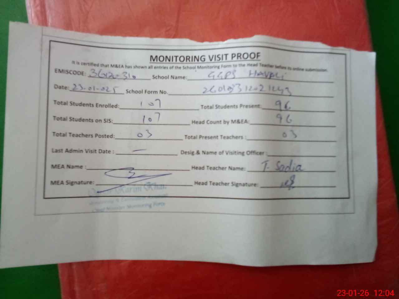 | Attendance Register | Head Teacher | MEA with School | Visit Proof |