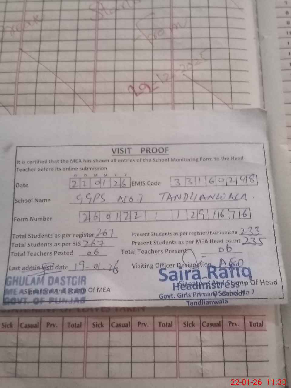| EMIS Code: 33160248 | Name of School: GGPS 7 TANDLIANWALA | |||