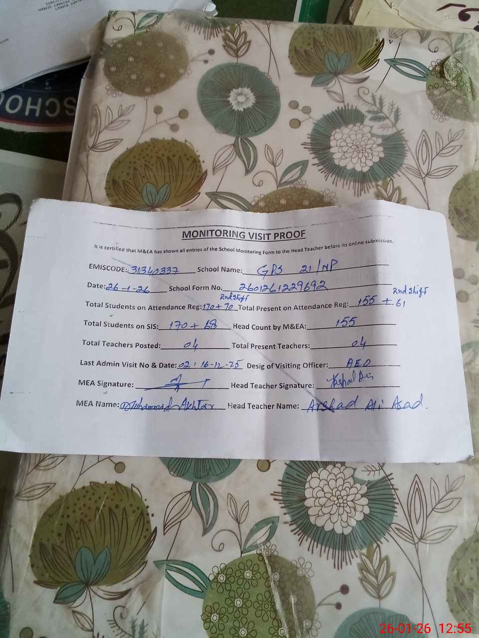 | Attendance Register | Head Teacher | MEA with School | Visit Proof |