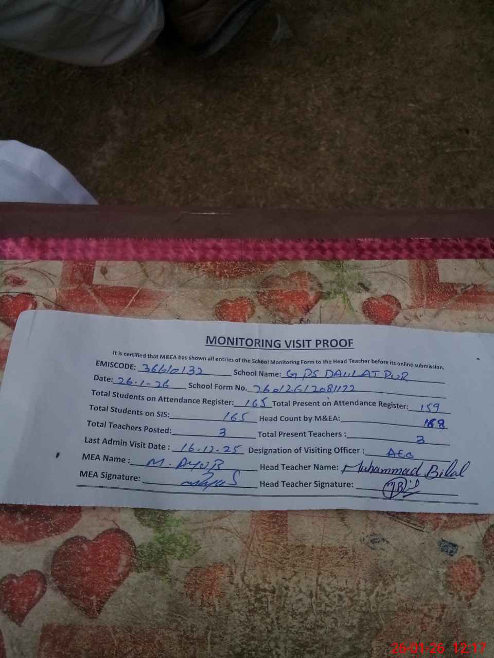 | Attendance Register | Head Teacher | MEA with School | Visit Proof |