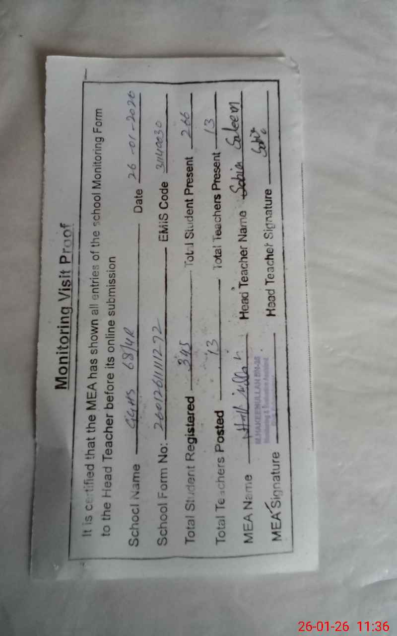 | Attendance Register | Head Teacher | MEA with School | Visit Proof |