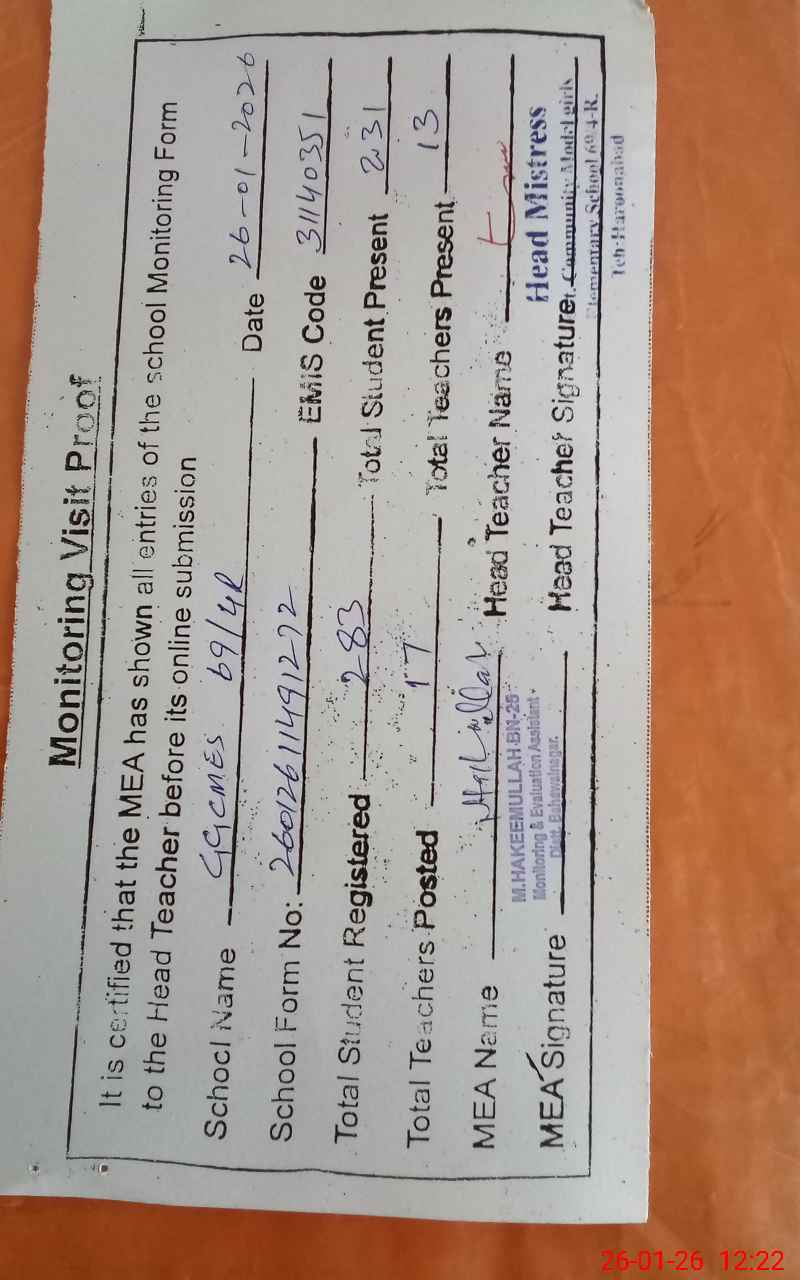 | Attendance Register | Head Teacher | MEA with School | Visit Proof |