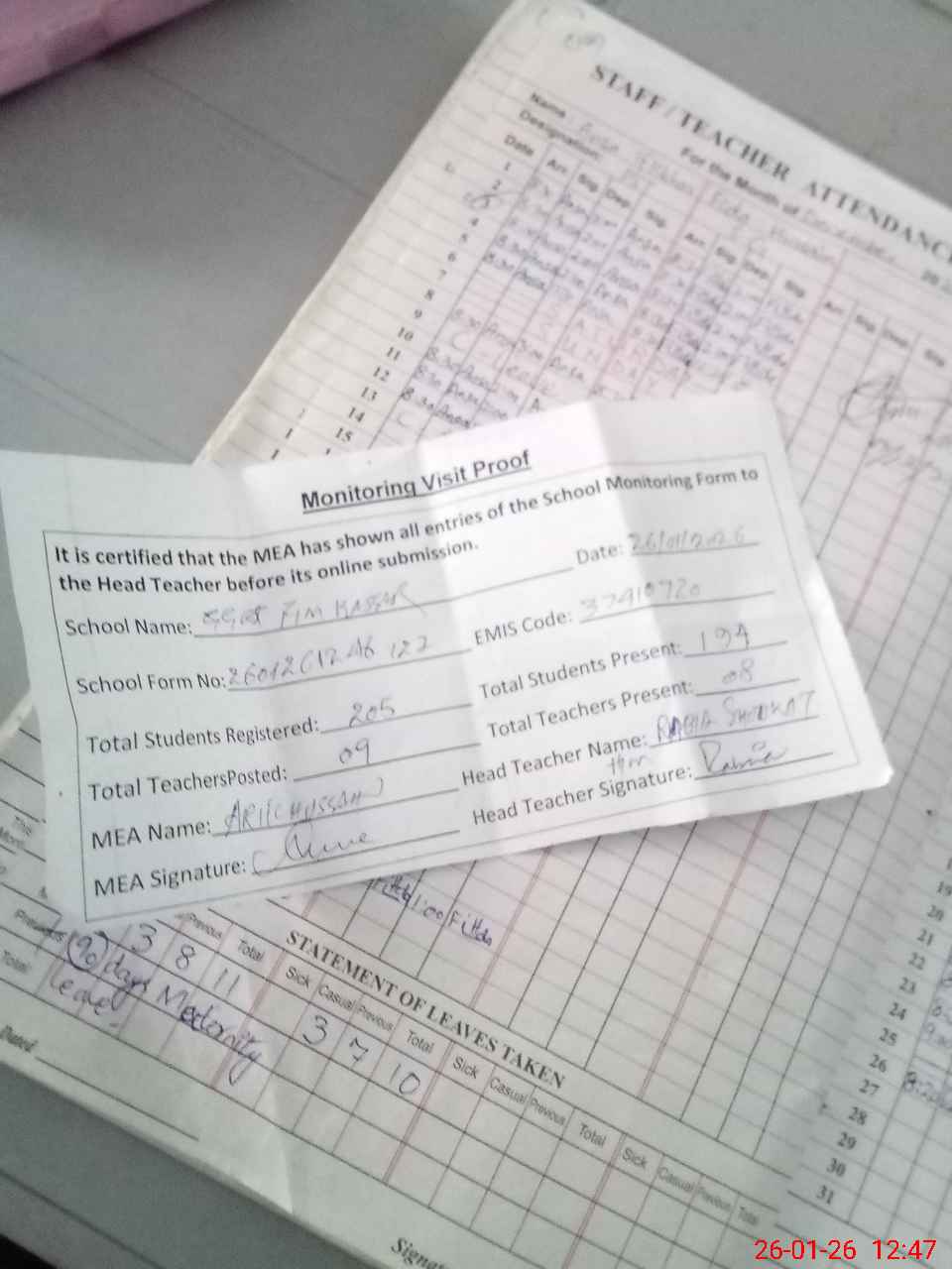 | Attendance Register | Head Teacher | MEA with School | Visit Proof |