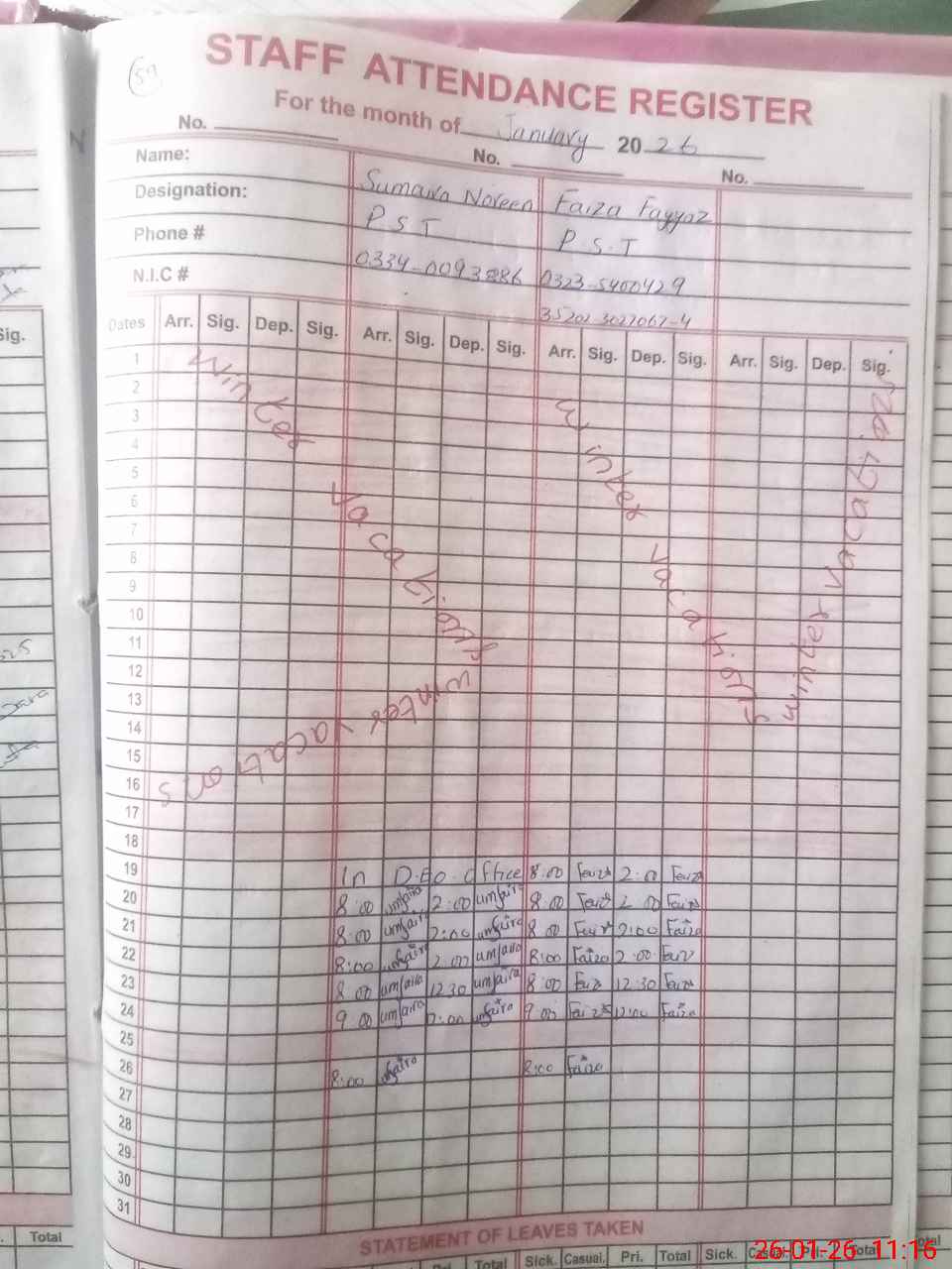| CNIC | Full Name | Designation | R/C | Absence During Last Calender Month |