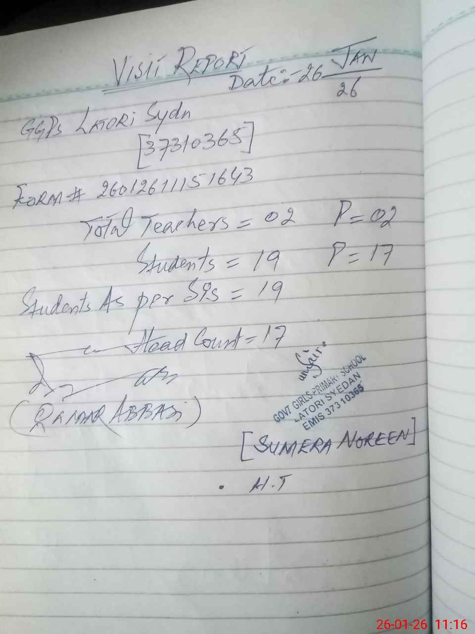 | Attendance Register | Head Teacher | MEA with School | Visit Proof |