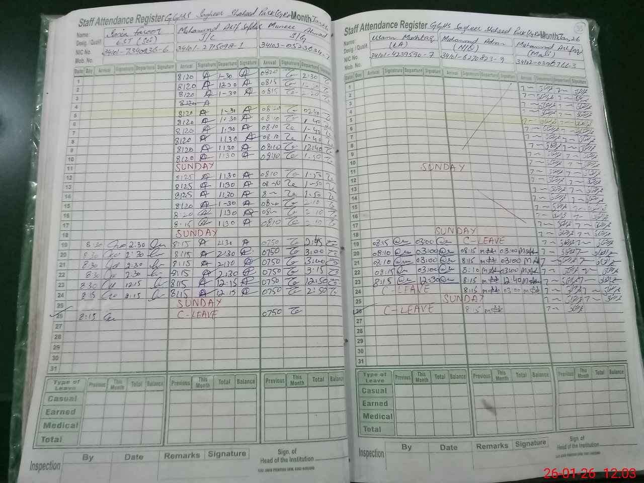 | CNIC | Full Name | Designation | R/C | Absence during last cal. month |
