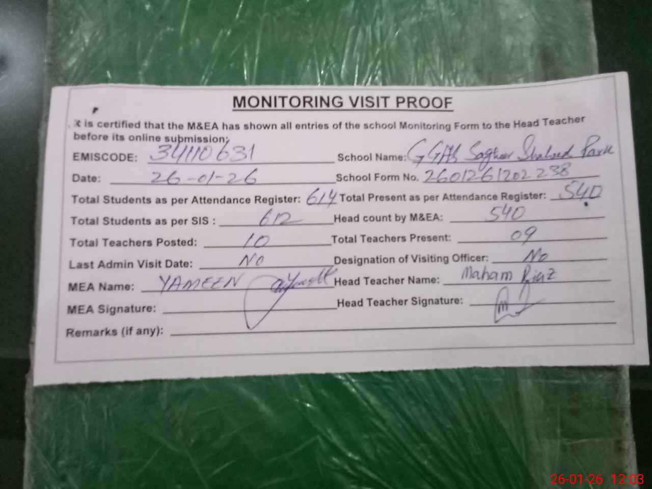 | Attendance Register | Head Teacher | MEA with School | Visit Proof |