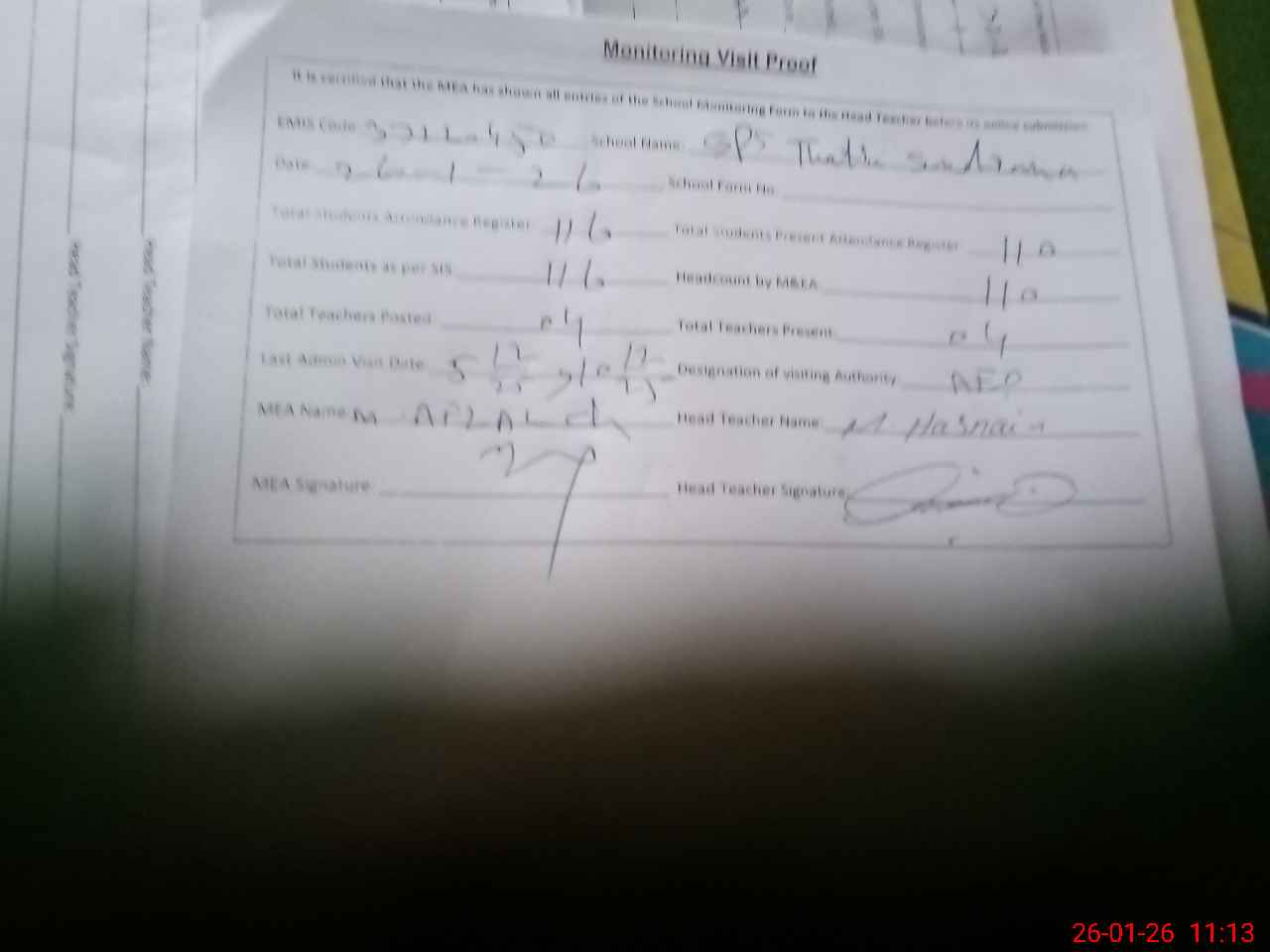 | Attendance Register | Head Teacher | MEA with School | Visit Proof |