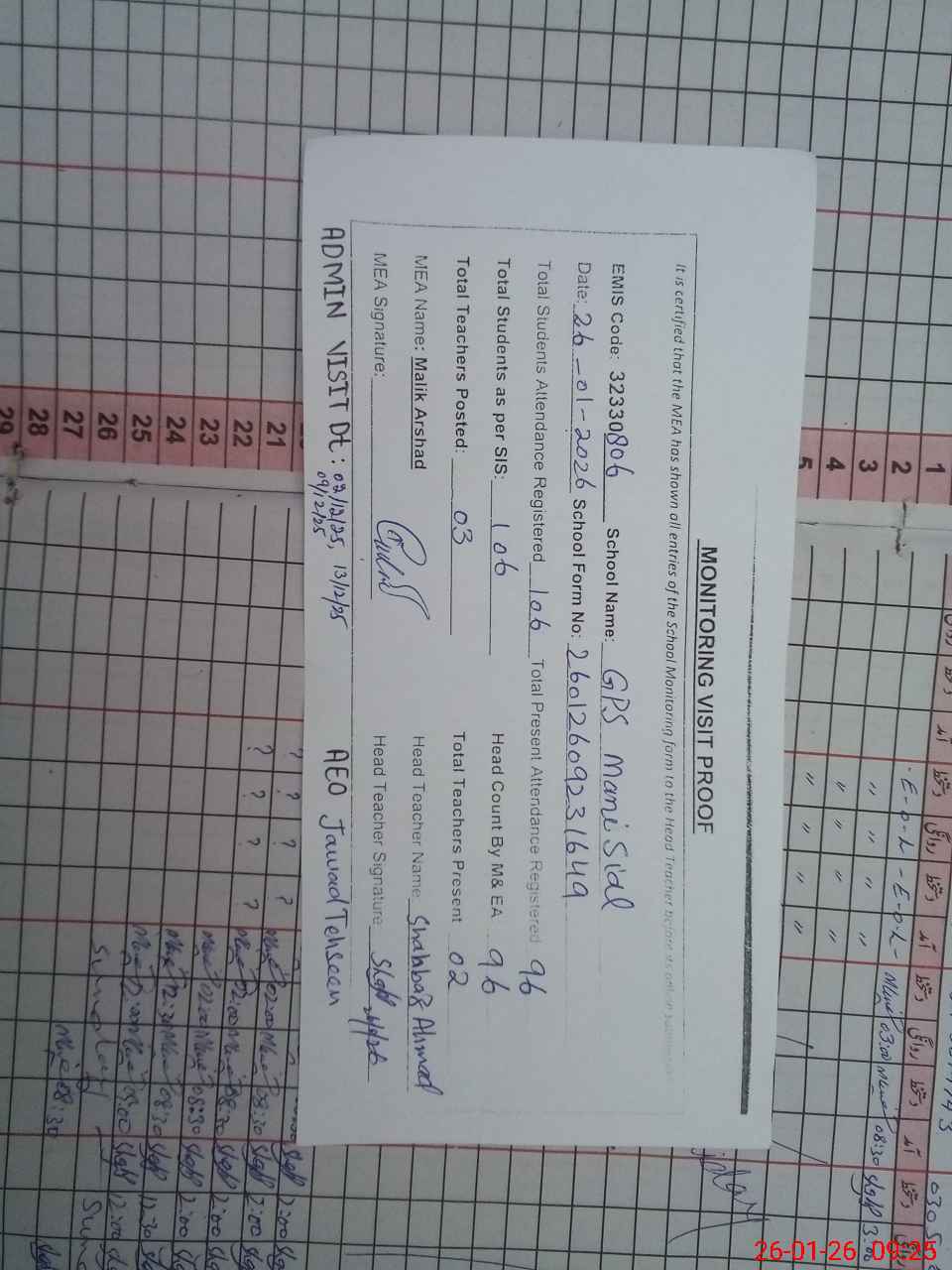 | Attendance Register | Head Teacher | MEA with School | Visit Proof |