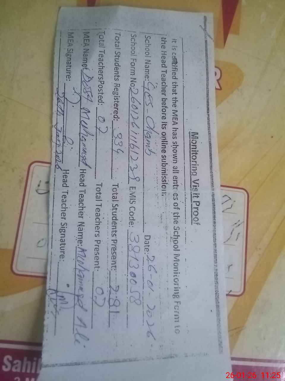 | Attendance Register | Head Teacher | MEA with School | Visit Proof |