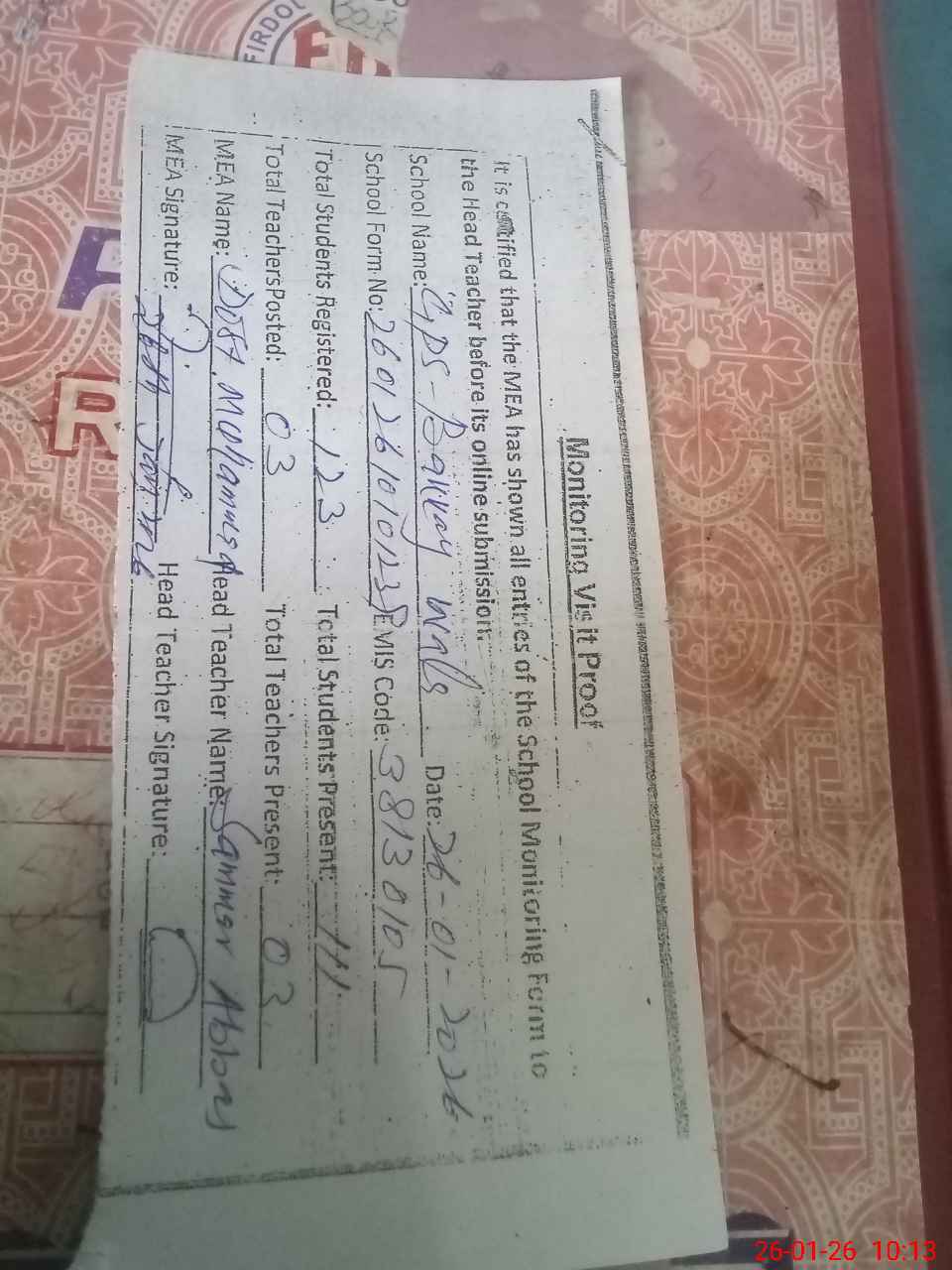 | Attendance Register | Head Teacher | MEA with School | Visit Proof |