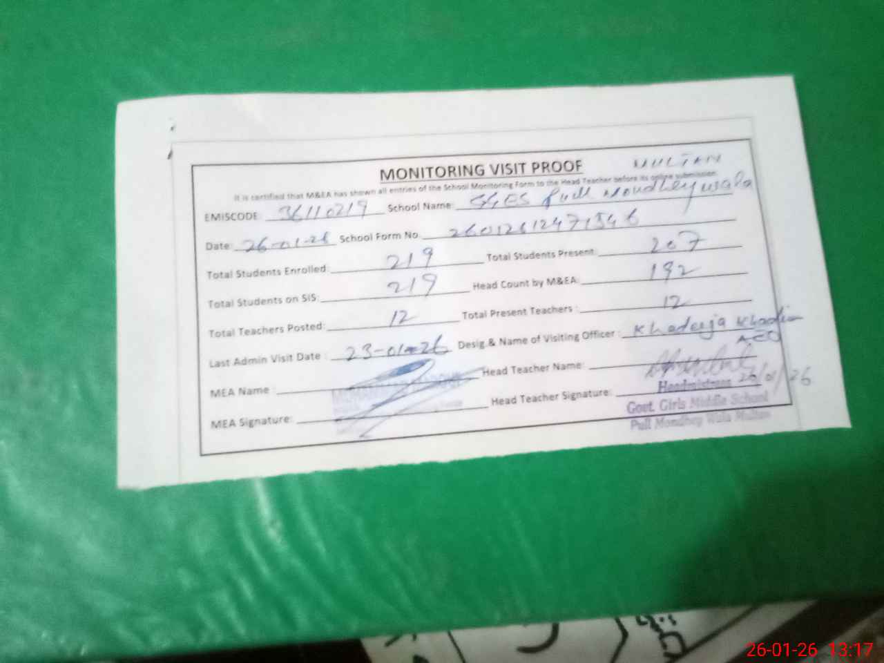 | EMIS Code: 36110219 | Name of School: GGES PULL MONDHAY WALA NAWAB PUR ROAD MULTAN | |||