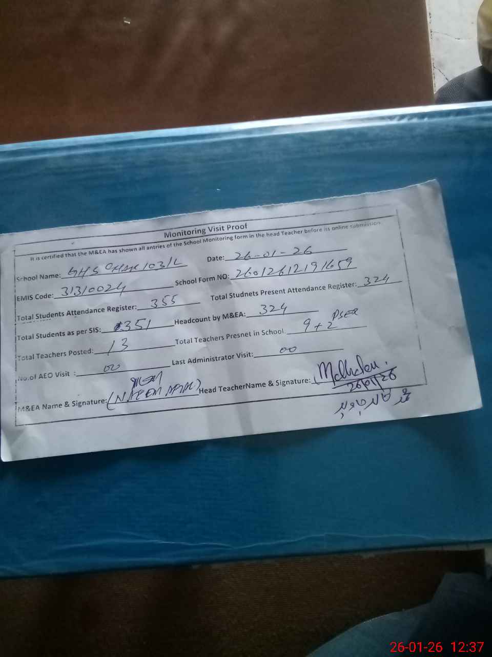 | Attendance Register | Head Teacher | MEA with School | Visit Proof |