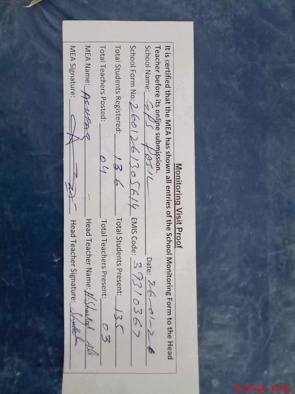 | Attendance Register | Head Teacher | MEA with School | Visit Proof |