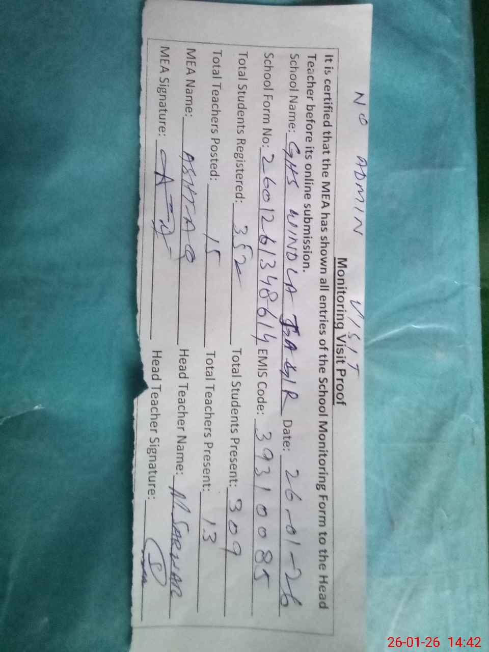 | Attendance Register | Head Teacher | MEA with School | Visit Proof |