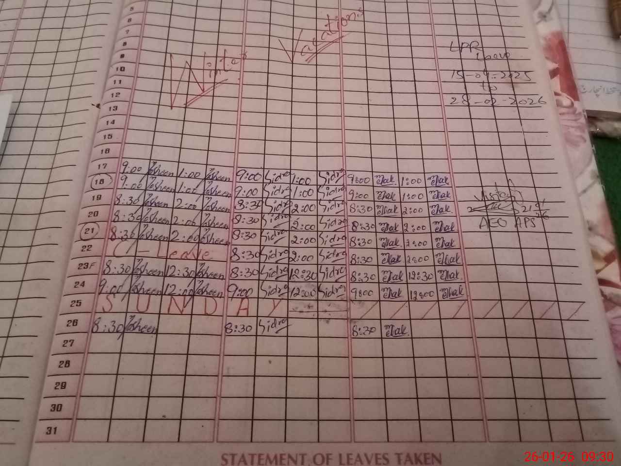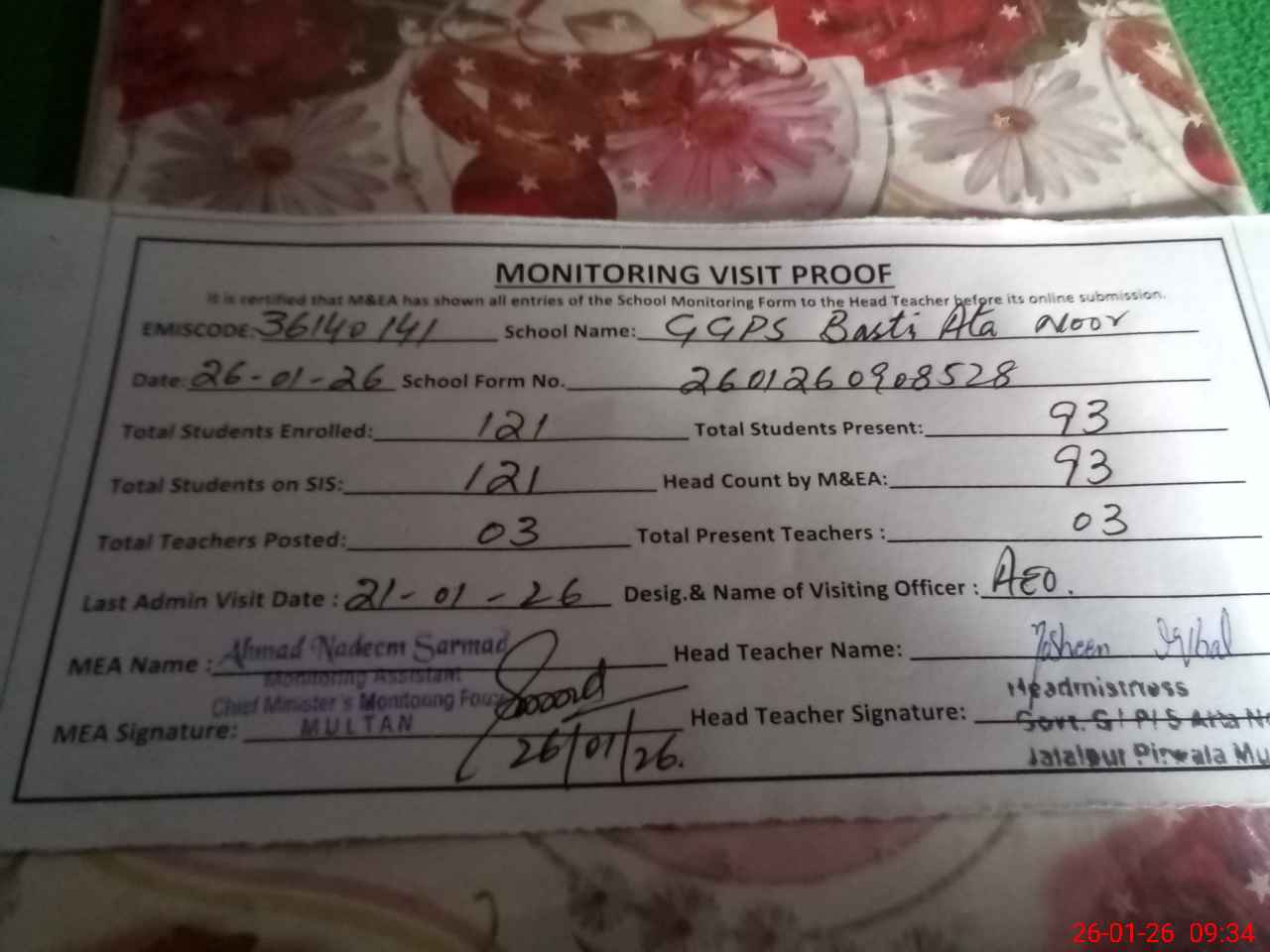 | Attendance Register | Head Teacher | MEA with School | Visit Proof |