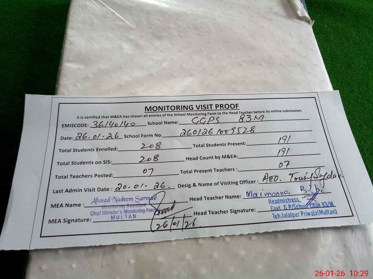 | Attendance Register | Head Teacher | MEA with School | Visit Proof |