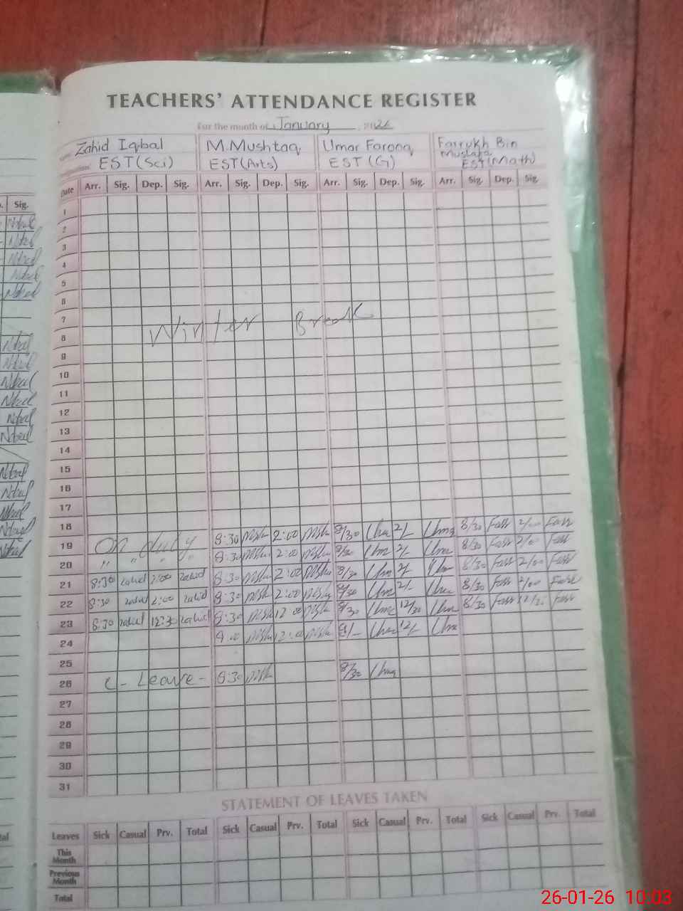 | 33**** | Fa**** Bi**** Mu**** | SESE Maths | Contract | 0 | 0 | 0 | 0 | 0 | 0 | 0 | 0 | 0 | Absent (Un-Authorized) |