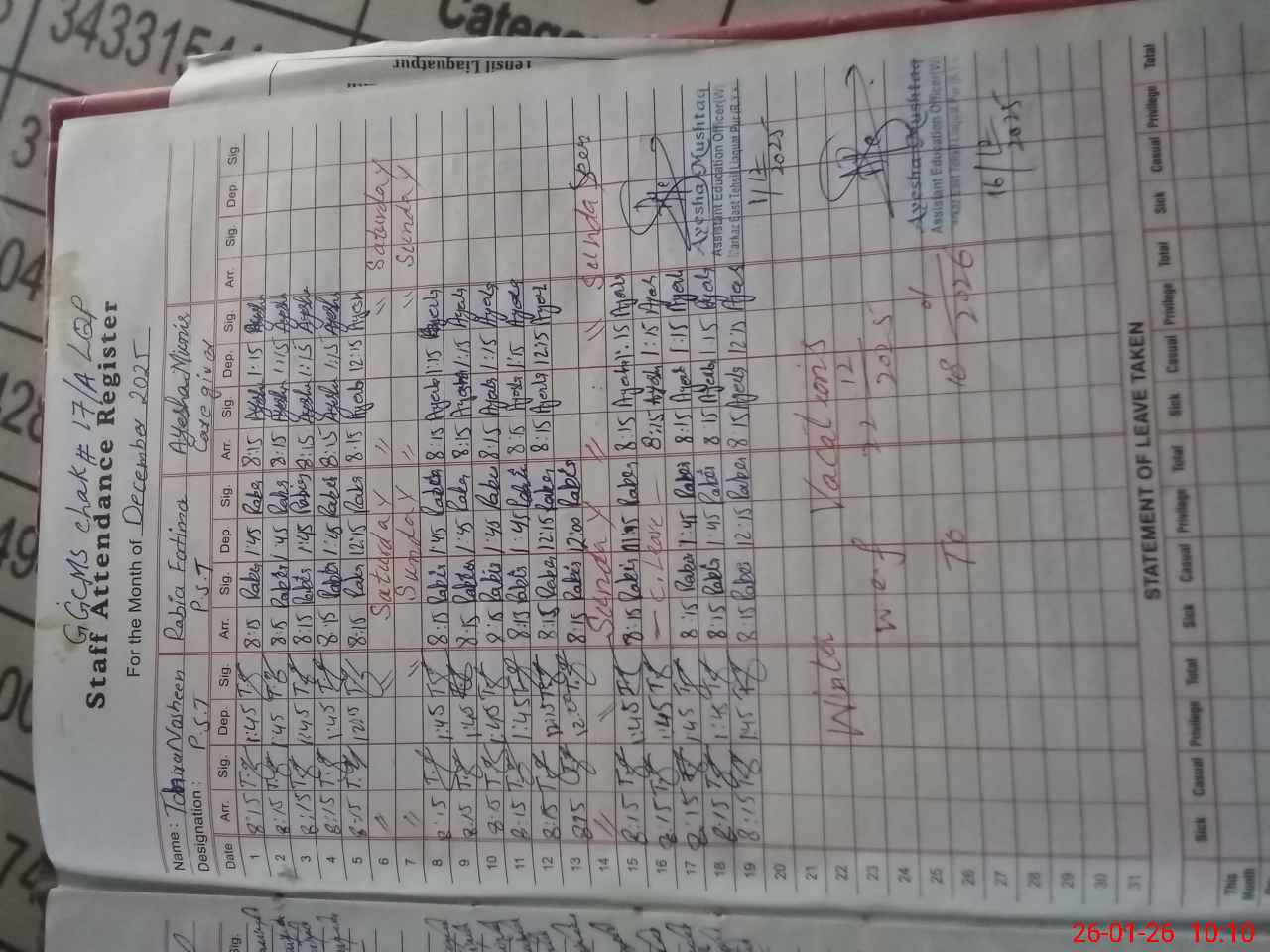 | Remarks (Use Separate Page if Required): 01 Class 4 servent named Khurram Iqbal is unauthorized attached with Deputy office. | |||||