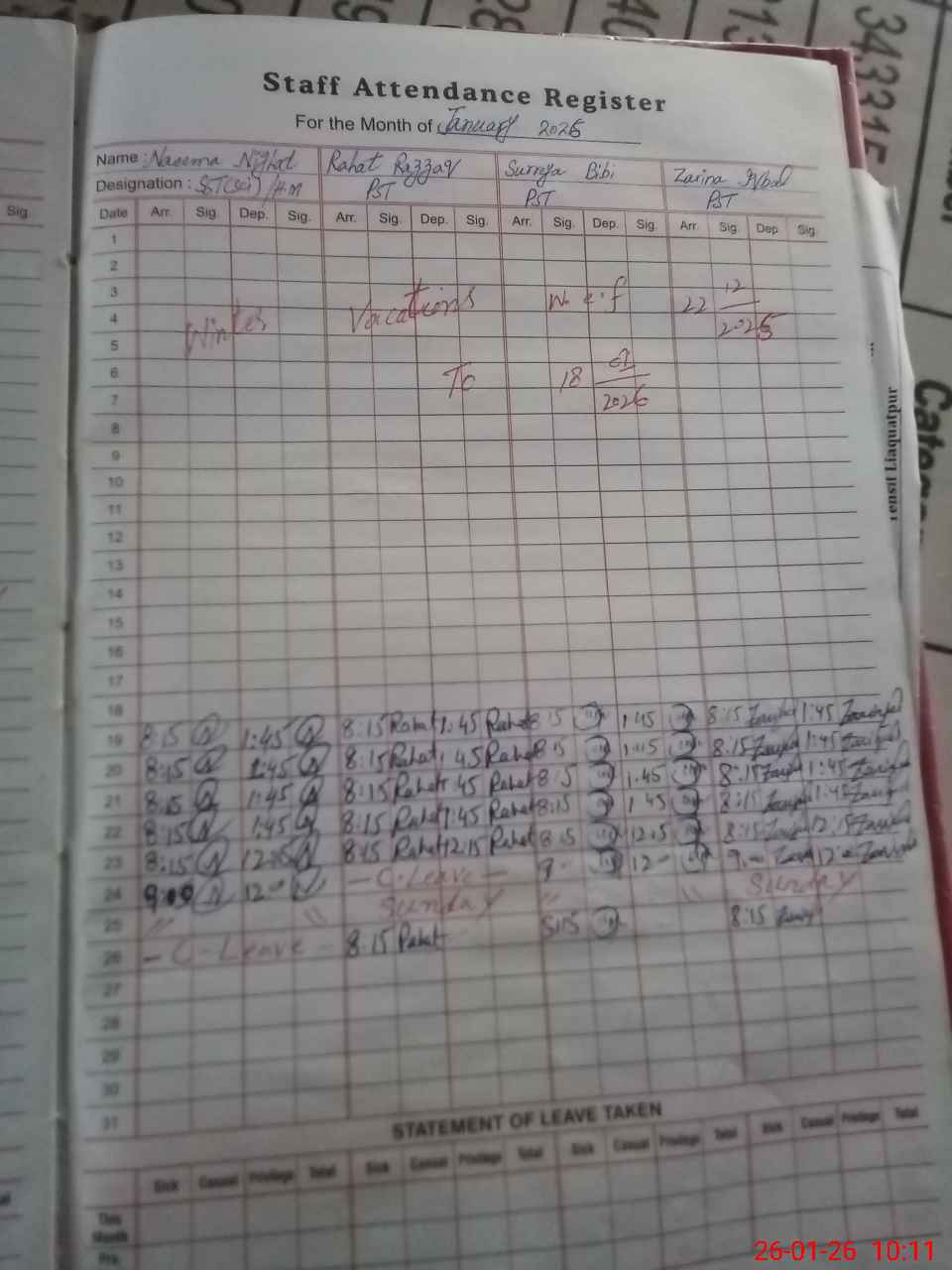 | Leave | Duty | Absent | Maternity | Medical | Ex- Pak |