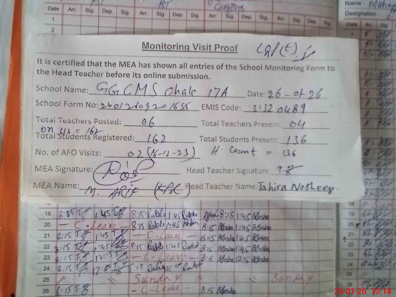 | Attendance Register | Head Teacher | MEA with School | Visit Proof |