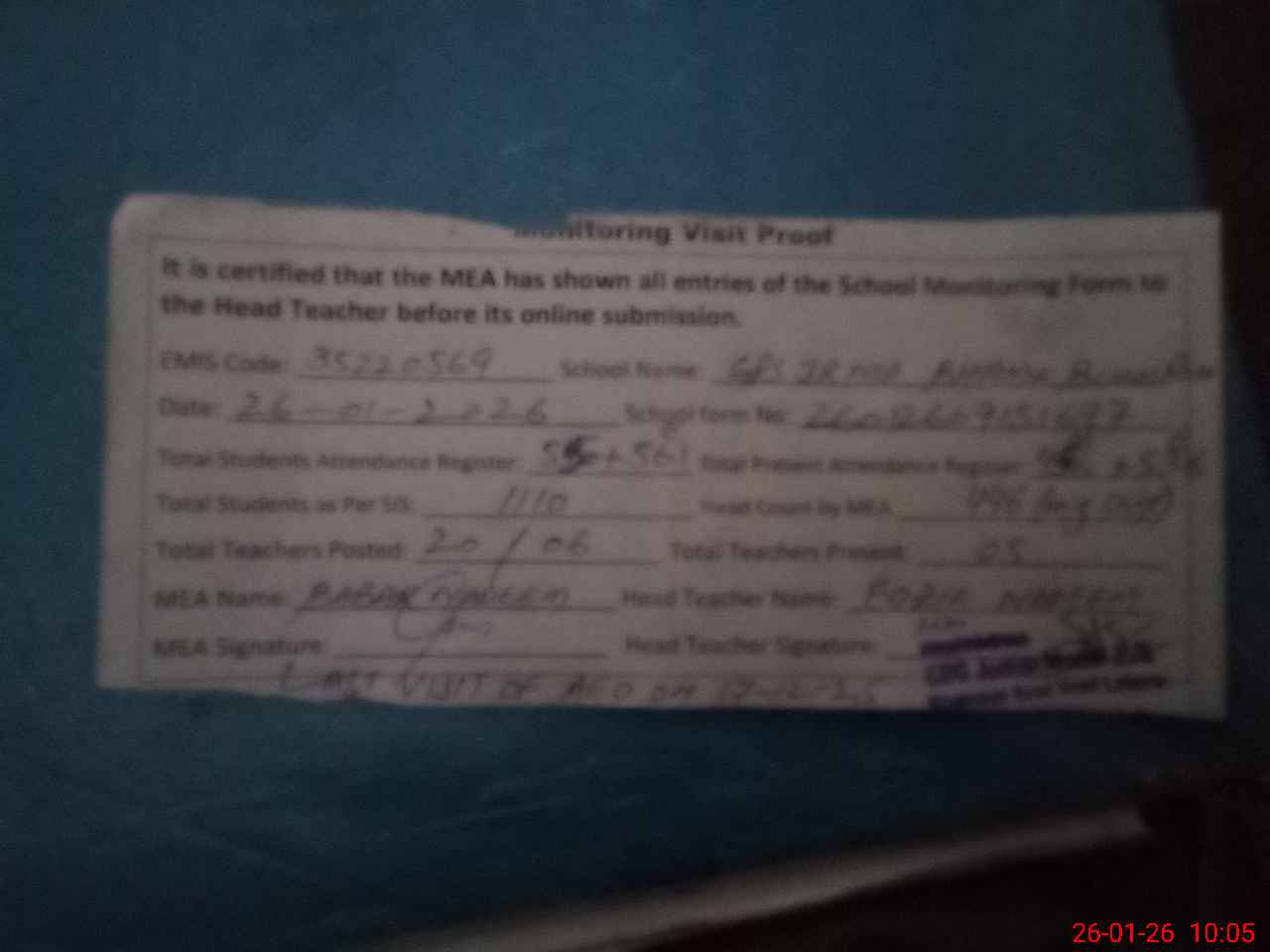 | Attendance Register | Head Teacher | MEA with School | Visit Proof |